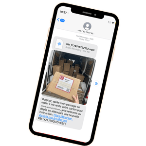 Exemple : capture d'écran d'un faux SMS avec image de colis personnalisé, le tout accompagné d'un message vocal d'un livreur, généré par IA, pour rendre l'arnaque encore plus convaincante.