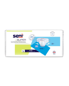 Seni Super Seni est une gamme de changes complets avec attaches pour les utilisateurs à mobilité réduite ou dépendants. Sa forme anatomique offre un ajustement parfait qui s’adapte à toutes les morphologies pour plus de sécurité, renforcé par des protections anti-fuites latérales sure. Sans latex, cette protection munie de la technologie « Extra Dry System » absorbe très rapidement. Un indicateur d’humidité informe de la saturation de la couche.